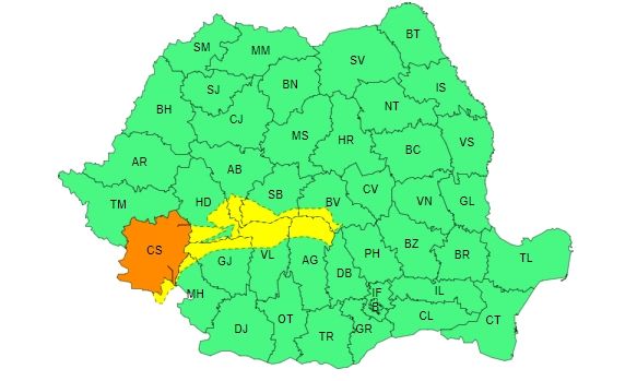 Codul galben este în vigoare în unele zone ale judeţelor Alba, Argeş, Braşov, Caraş-Severin, Gorj, Hunedoara, Mehedinţi, Sibiu şi Vâlcea.