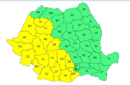 Meteorologii anunţă cod galben de instabilitate atmosferică pentru Oltenia, Banat, Crişana, vestul Transilvaniei şi al Munteniei.