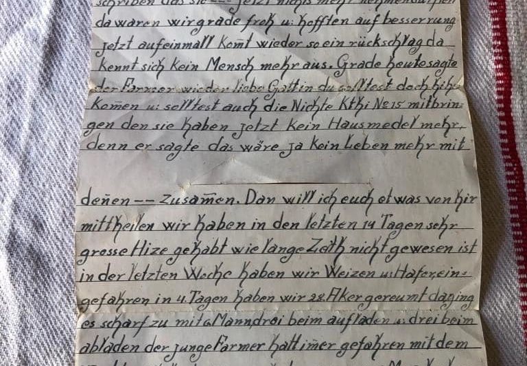 „Acum vreau să îţi povestesc ceva de aici. În ultimele zile a fost o caniculă cum nu a mai fost de mult timp. În ultima săptămână am recoltat grâu și ovăz. Am eliberat în 4 zile 22 de acri. Doi bărbați încărcau, alții doi descărcau. Fermierul tânăr conducea tractorul. Prin asta închei scrisoarea. Vă urez sănătate. Al tău soț și al vostru fiu de pe frontul îndepărtat", sunt doar câteva dintre rândurile scrise. Din păcate, aceste gânduri nu au mai ajuns niciodată la femeia care locuia în satul Viscri.