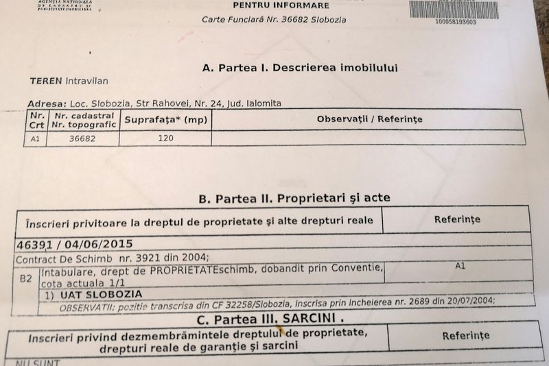 Corneliu Grigore este omul care are o problemă administrativă pe care conducerea Primăriei Slobozia nu vrea să o rezolve deşi instituţia este cea care a provocat întreagă dispută legată de proprietatea omului.Bărbatul deţine o suprafaţă de teren de 120 mp pe strada Dorobanţi din municipul Slobozia, teren atribuit pe baza unui schimb aprobat prin HCL Slobozia nr. 96 din 28.05.2004 şi pentru care deţine titlul de proprietate cu nr. 001991/01100.Terenul a făcut obiectul unui contact de închiriere şi în anul 2018 omul a decis de comun acord să încheie un contract de vânzare-cumpărare cu chiriaşul. Drept pentru care a avut nevoie de un extras de informare de la Oficilul de Cadastru şi Publicitate Imobiliară Ialomiţa, instituţie ce i-a emis documentul în baza cererii 44655 din 6.06.2018. Atunci a constatat cu stupoare că pe terenul pe care era proprietar de 14 ani şi pe care plăteşte anual impozit este intabulat drept proprietar UAT Slobozia![caption id="attachment_72539" align="aligncenter" width="1500"]