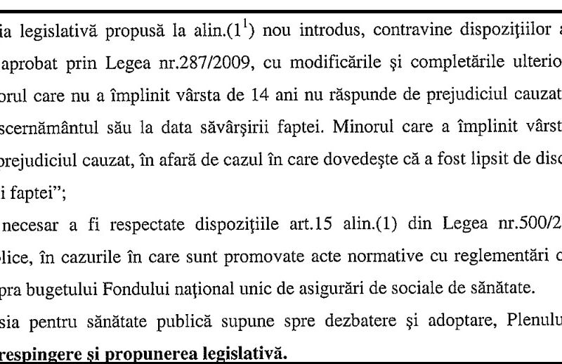 Deși în comisii proiectul a avut avize favorabile, inclusiv cu votul membrilor PSD, în plen votul a fost negativ. În opinia lui Ionașcu a fost vorba despre un ordin venit de la partid, care a înfrânt voința senatorilor PSD -ALDE.Blocarea proiectului s-a declanșat la comisia pentru sănătate publică din Senat, care a respins propunerea pe baza unor argumente scoase din burtă. Argumentele invocate de această comisie sunt halucinante – este invocat un articol din Codul Civil care prevede că minorul care nu a împlinit vârsta de 14 ani răspunde pentru pagubele create dacă nu se dovedește că nu a avut discernământ! Aberație mai mare nici că se putea. Al doilea argument ar fi acela că propunerea are impact asupra bugetului și ca atare trebuie indicată sursă de finanțare! Altă aberație.[caption id="attachment_72251" align="aligncenter" width="696"]