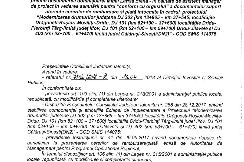 Aici regăsim majorarea salariului administratorului la fabuloasa sumă de 19.690 de lei lunar. De menționat că un vicepreședinte al CJ încasează 20.800 de lei lunar. Pe parcursul anului 2018, Larisa Mihai a primit tot soiul de stipendii motivate de participarea acesteia la implementarea unor proiecte finanțate din fonduri europene.În aprilie 2018 este numită prin dispoziția tulburatului președinte în calitate de asistent al managerului de proiect SMIS 114075, proiect care presupune asfaltarea câtorva kilometri de drumuri județene. Atribuțiile Larisei Mihai se rezumă la semnarea „conform cu originalul” a unor documente aferente proiectului (vezi facsimil).
