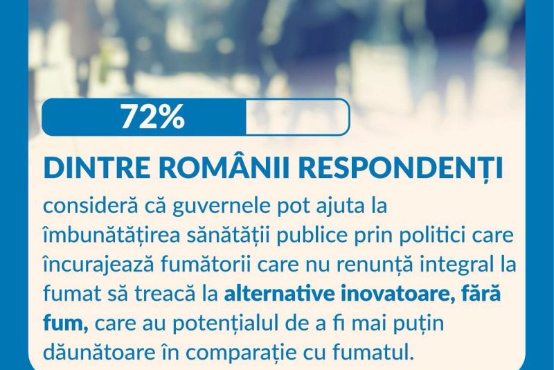 - 76% dintre românii respondenți consideră că fumătorii adulți ar trebui să primească informații corecte, fundamentate științific, despre produsele fără fum, care, deși nu sunt lipsite de riscuri, reprezintă o alternativă mai bună la continuarea fumatului.