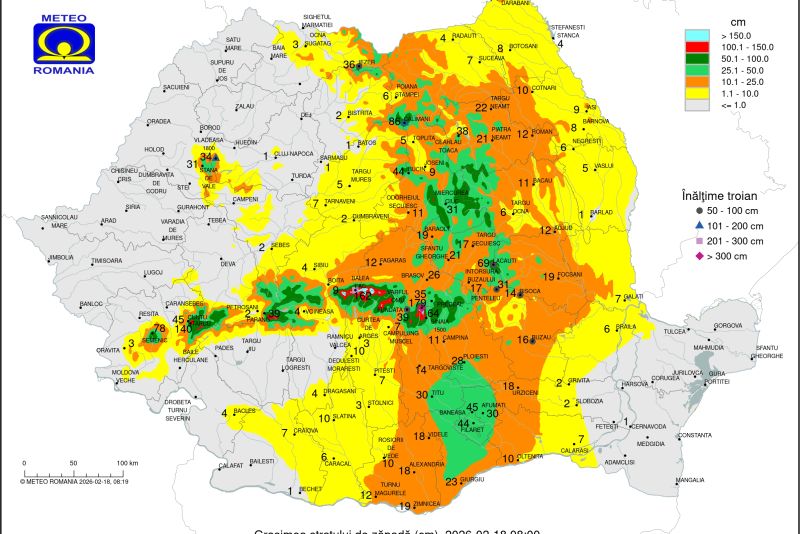 Cele mai mari depuneri de zăpadă s-au înregistrat la Bâlea Lac, cu 162 cm, și în Munții Semenic, cu peste 140 cm, conform datelor ANM la ora 8:00.