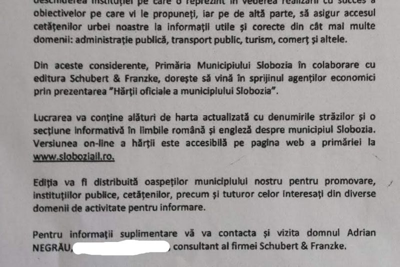De mai mulți ani Primăria Slobozia a împământenit o colaborare dubioasă cu o editură austriacă, Schubert & Franzke Ges.m.b.H., St. Pölten, care vinde hărți de toate tipurile. Cum chelul nu e destul de chel fără o tichie de mărgăritar, orașul compus din două blocuri și o comedie (așa era recunoscut în vechime) și-a tras și el hartă. Nu de alta, dar miile de turiști care vin anual în praful și mizeria din Bărăgan nu se puteau orienta către cele două muzee și o catedrală fără un instrument analogic și anacronic făcut pe bani buni și la un tiraj garantat de 5000 de exemplare!Pentru că municipalitatea nu are destui bani, austriecii au venit cu ideea creață ca agenții economici deținători de buticuri care vând pe caiet sau companii cu bube-n cap să plătească pentru această hartă cumpărând publicitate. Pentru tarife modice, cuprinse între 2100 și 6650 de lei, firmele cumpără chenare publicitare de câțiva centimetri pătrați unde își inserează diverse informații comerciale. Astfel, toată lumea este mulțumită. Turistul nu ratează buticul care vinde ciungă și apă plată la PET, iar primăria este satisfăcută pentru că a reușit să nu rămână ultima găină din Gostat, adică o urbe fără hartă.Dimensiunea dramatică a prostiei este dată de faptul că, ceea ce Google oferă gratis și la zi pe orice telefon mobil, „austriecii” vând pe bani grei. Iar fraieri sunt destui. Metoda de stors bani de la fraieri sau de la băieții care au „datorii” morale izvorâte din contracte cu primăria au fost vizitați de agentul editurii, dotat cu o scrisoare de la primarul Mocioniu scrisă cu mare fereală ca să nu dea în penal: