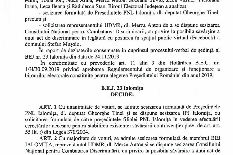 Cu majoritate de voturi s-a dispus sesizarea Consiliului Național pentru Combaterea Discriminării, precum și înlăturarea de pe facebook a postării președintelui executiv PSD Ialomița.