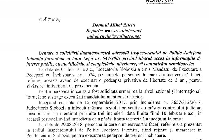 . Într-un final IPJ Ialomița a reușit să ne trimită un răspuns la cererea transmisă acum aproape o săptămână. Lucrurile sunt simple. Infractorul dispăruse dar ei nu l-au căutat. Mă rog, nu în Bora unde condamnatul își făcea veacul.