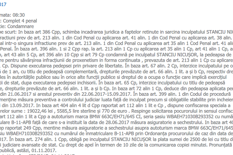 Sentința de condamnare a interlopului suspect.[/caption]La data de 31 ianuarie 2018, Curtea de Apel București respinge ca nefondate apelurile declarate de inculpat și de Parchet, hotărârea de condamnare rămânând definitivă.De atunci și până la data crimei Stanciu, care se afla sub control judiciar la IPJ Ialomița la data pronunțării hotărârii definitive, s-a plimbat pe sub nasul polițiștilor ialomițeni fără a fi deranjat. Opt luni mai târziu, condamnatul neîncarcerat a fost identificat ca participant la crima din cartierul Bora.[caption id="attachment_23002" align="alignnone" width="300"]