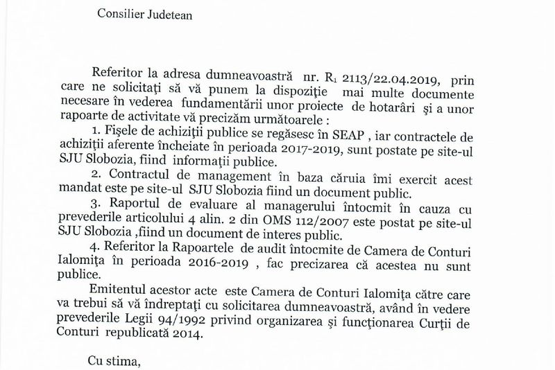 Reamintim că în august 2018 Spitalul de la Slobozia a fost retrogradat de la categoria a III-a la categoria a V-a de acreditare, ca urmare a gravelor deficiențe constatate de Autoritatea Națională de Management al Calității în Sănătate, informație negată la vremea respectivă de manager dar recunoscută acum într-un așa zis raport de activitate întocmit la acoperire.Consilierul județean Dragoș Soare (PNL) a încercat să afle ce se întâmplă în spitalul finanțat de CJ și ce încearcă să ascundă Moraru și protejata sa. Demersul lui Soare venea după ce presa a dezvăluit numeroase matrapazlâcuri legate de achizițiile publice fără licitație, de majorarea arieratelor și de modul în care managerul se comportă cu angajații ( a existat o reclamnație trimisă de doctori la Ministerul Sănătății, care a pasa-o spre mușamalizare la Moraru).Soare a solicitat un set de informații și documente legate de achizițiile publice, evaluarea activității managerului pe care ar fi trebuit să o facă o comisie numită de președintele CJI, contracte de achiziții, indicatori de performanță ai managerului și contractul acestuia. După fix 30 de zile de la formularea solicitării, protejata lui Moraru răspunde cu o adresă plină de minciuni și falsuri pe care o reproducem mai jos: