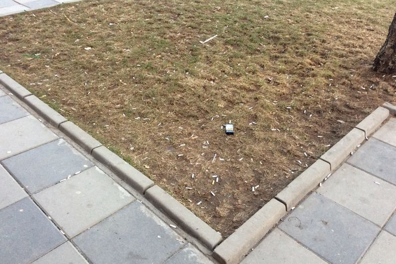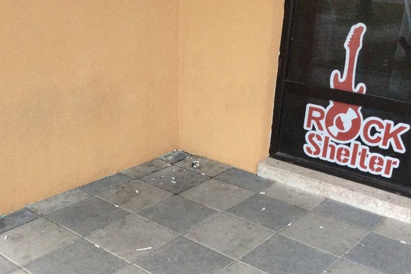 Mai multe fotografii vorbesc de la sine de „respectul” şi „bunul simţ” al clienţilor fumători care sunt obligaţi să-şi consume viciul în afara barului. Chiştoacele sunt mai dese decât firele gazonului abia plantat de municipalitate, dalele de beton sunt aproape negre de scrumul tutunului ars iar sticlele goale de bere sunt puse ca la expoziţie direct pe geamul spaţiului de birouri.