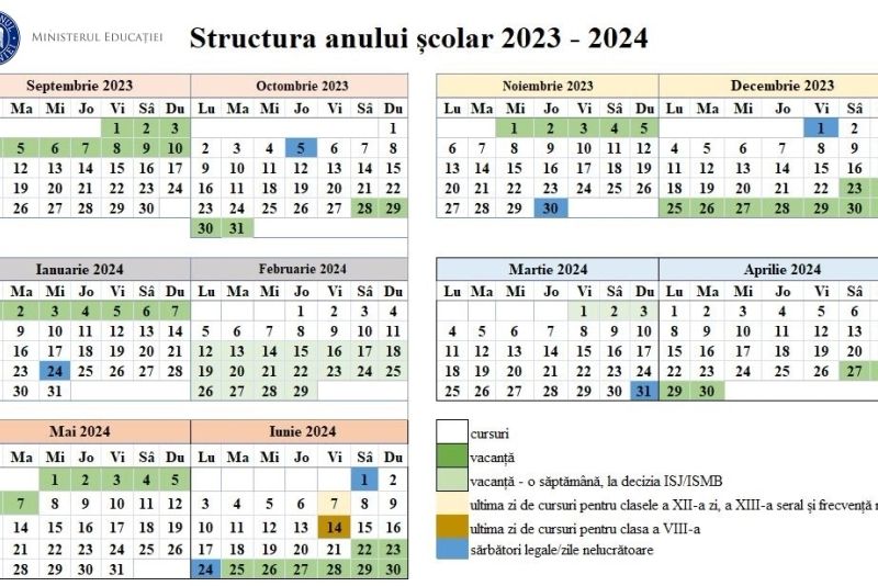 - durata cursurilor: 36 de săptămâni- data începerii cursurilor: 11 septembrie 2023- data încheierii cursurilor: 21 iunie 2024- săptămâna de vacanță, la decizia inspectoratelor școlare județene/al municipiului București, în perioada 12 februarie – 3 martie 2024.- desfășurarea Programului național „Școala altfel” și a Programului „Săptămâna Verde” în perioada 11 septembrie 2023 – 26 aprilie 2024. Programele se vor desfășura în intervale de cursuri diferite", informează Ministgerul Educației, într-o postare făcută pe Facebook.