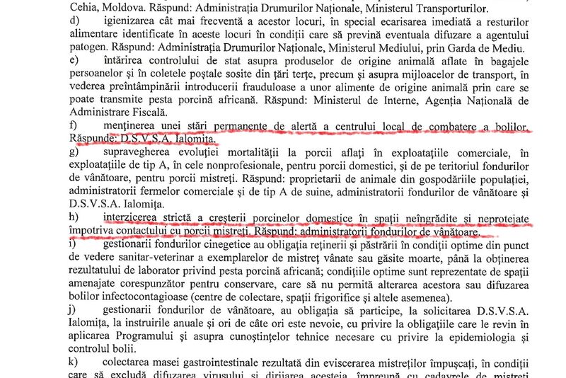 Pesta porcină africană combătută pe hârtie[/caption]Pe 11 pagini se trasează măsuri și se stabilesc responsabilități. Exemple:-DSVSA execută supravegherea intensivă a porcilor domestici și mistreți de pe teritoriul județului.În realitate DSVSA nu știe câți porci domestici cresc liberi la pădurari sau în jurul exploatațiilor agricole din Balta Ialomiței. Despre numărul de mistreți există informații vagi și aproximative. De aceea, în comunicarea publică a DSVSA, omul este factorul principal de răspândire a bolii.- Administratorii fondurilor de vânătoare interzic creșterea porcilor domestici în libertate, în afara unor spații neîngrădite și neprotejate pentru contactul cu mistreții.Deși nu este clar cum puteau acționa administratorii fondurilor de vânătoare ca să interzică astfel de practici, este cert că aceștia nici măcar n-au observat fenomenul. Săptămâna trecută au fost raportați în Balta Ialomiței 5 porci domestici infectați.N-au existat stimulente pentru vânători pentru a participa la omorârea mistreților, așa cum recomandaseră experții CE. Vânătorilor li s-a redus taxa de participare și cam atât. În aceste condiții, eliminarea preventivă a populației de mistreți din Balta Ialomiței și de pe fondurile de vânătoare din județ nu s-a făcut, iar asta a amplificat răspândirea virusului de pestă porcină africană.Cât despre colectarea masei gastrointenstinale a mistreților omorâți de la începutul anului nu există date publice cu privire la numărul de recoltări și rezultatele analizelor.