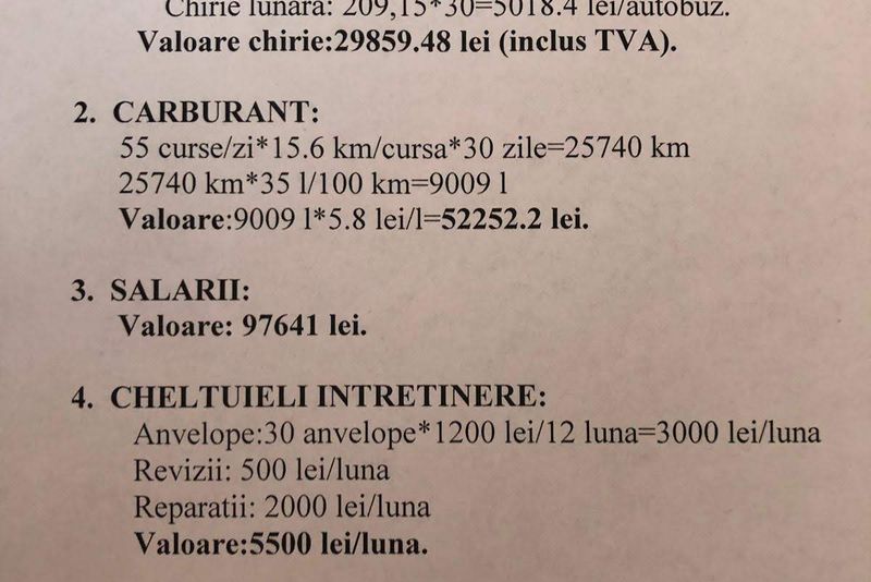 Potrivit calculelor realizate de funcționarii primăriei, serviciul public de transport va avea un buget lunar de 187.502 lei. Această sumă este defalcată pe următoarele elemente de cheltuieli:[caption id="attachment_72410" align="aligncenter" width="696"]