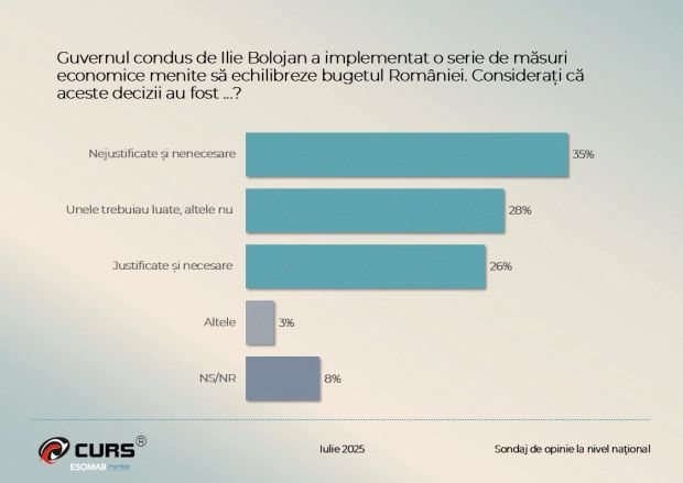 Potrivit sondajului, 35% dintre respondenți consideră că măsurile de austeritate luate de Guvernul Bolojan sunt nejustificate și nu sunt necesare. Un alt segment de 28% susține că unele dintre aceste măsuri ar fi trebuit adoptate, în timp ce doar 26% cred că deciziile anunțate sunt justificate și necesare.