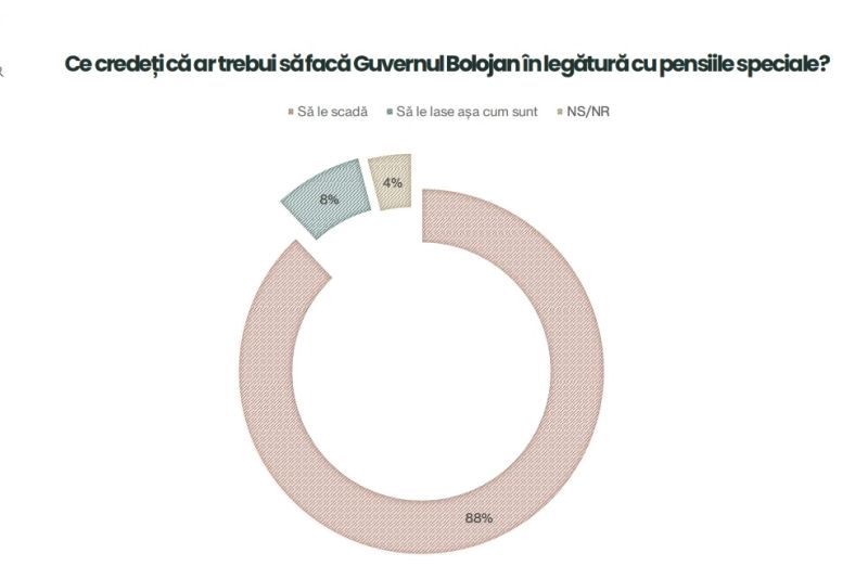 Întrebați ce cred că ar trebui să facă Guvernul Bolojan în legătură cu pensiile speciale, 88% dintre cei intervievați spun că acestea ar trebui să fie scăzute.