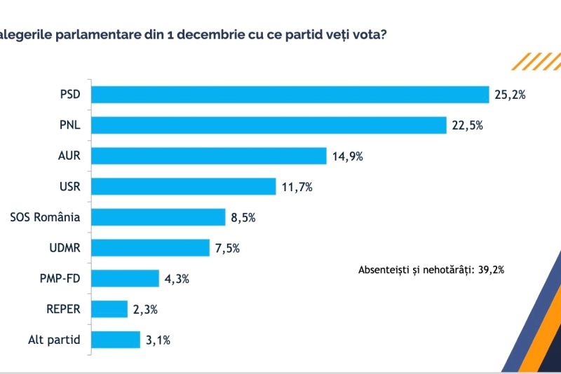 În cazul parlamentarelor, pe primul loc este PSD cu 25,2%, urmat de PNL cu 22,5% și de AUR cu 14,9%. USR are 11,7%, SOS România are 8,5%, UDMR 7,5%, PMP-FD are 4,3%, iar REPER are 2,3%.