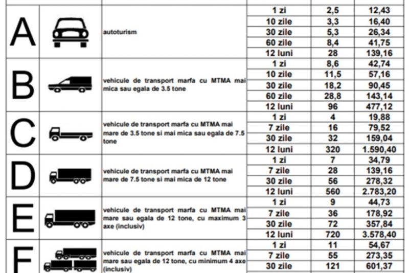 Pentru un autoturism, prețul unei roviniete de o zi va fi de 12,43 de lei, iar pe 10 zile șoferul va trebui să achite suma de 16,40 de lei. Dacă dorește pentru 30 de zile, el va avea de plătit suma de 26,34 de lei.
