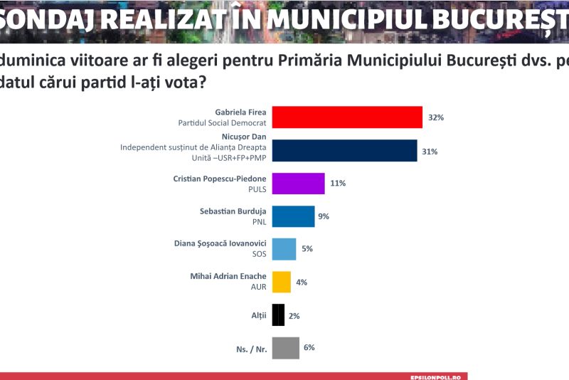 Aceste cifre sugerează o cursă strânsă pentru funcția de primar al Capitalei, cu Gabriela Firea și Nicușor Dan aproape la egalitate.