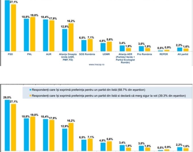 PSD ar obţine 29,5% din voturi, PNL – 18,8%, AUR – 18,4% dacă duminică ar avea loc alegeri pentru Parlamentul European, relevă un sondaj realizat de INSCOP, procentele fiind raportate la numărul celor care au exprimat preferinţa pentru un partid din listă, indiferent dacă declară că vin sau nu vin sigur vot. Procentele se modifică în cazul celor care declară că în mod singur vor merge să voteze şi care şi-au exprimat preferinţa pentru un partid din listă.