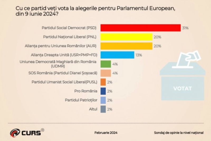În privința opțiunilor de vot la alegerile europarlamentare, 31% dintre români ar pune ștampila pe PSD, în timp ce AUR și PNL ar obține ambele câte 20%. Pe locul 4 s-ar afla Alianța Dreapta Unită, cu 13%. Alte formațiuni politice ar obține sub 5%.