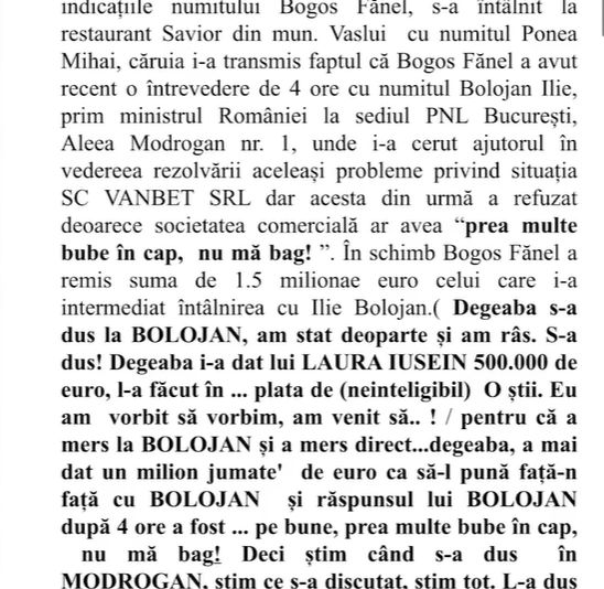 Într-o conversație surprinsă de DNA, omul de afaceri se laudă că „marți m-a chemat Bolojan la el”, prin intermediul trezorierului PNL. Ulterior, surse judiciare afirmă că întâlnirea ar fi durat aproape patru ore, la sediul central al partidului, și că pentru intermediere s-ar fi plătit 1,5 milioane de euro.