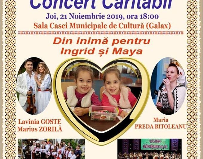 Casa de Cultură Municipală (fostul cinematograf Galax) găzduiește de la ora 18.00 un concert caritabil pentru sprijinirea familiei Costache în teribila misiune de a-și vindeca fetițele gemene.„Din inimă pentru Ingrid și Maya” este un eveniment artistic remarcabil ce va fi susținut de Lavinia Goste, Marius Zorilă și Nicoleta Rădinciuc. Alături de ei vor urca pe scenă Ansamblul Doina Bărăganului, Corala Sfântul Mina și Grupul de cateheză Speranța.